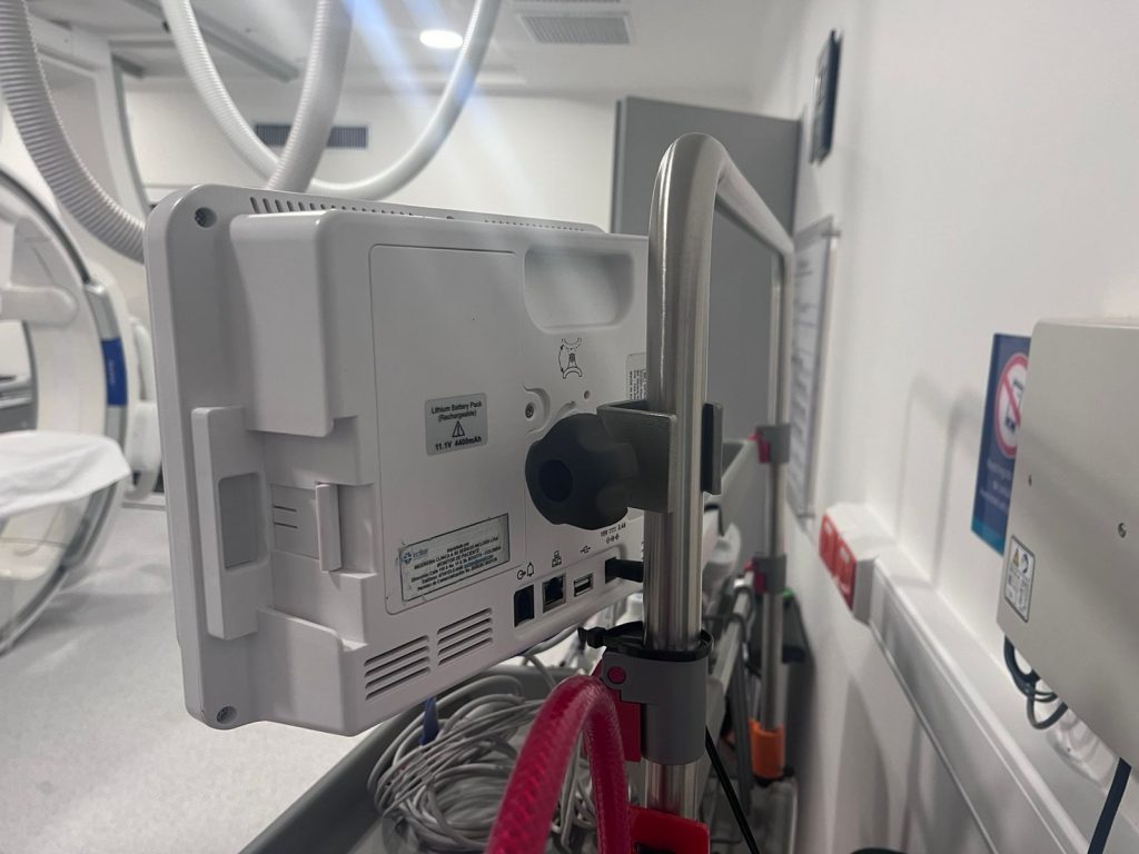 Prensa de sujeción para monitor a tubo de atril para camilla. Material: Acero inox 304, con tornillos de sujeción y buje dilatador.