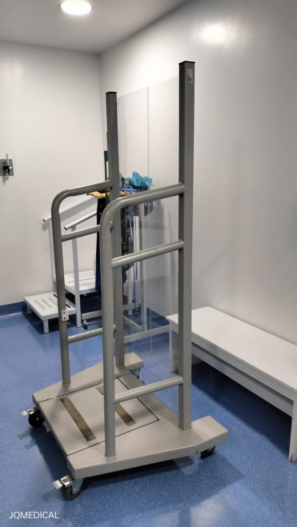 Plataforma para toma de placas verticales pie, con dos pasos y barandas en plástico radiolúcido, posicionadores en flat panel en posición horizontal y vertical, con 2 ruedas fijas para su desplazamiento. Material acero CR con pintura electrostática gris, plástico radiolúcido. Medidas aprox: 52x47x1.43 altura, con acceso directo derecho o izquierdo según el caso.