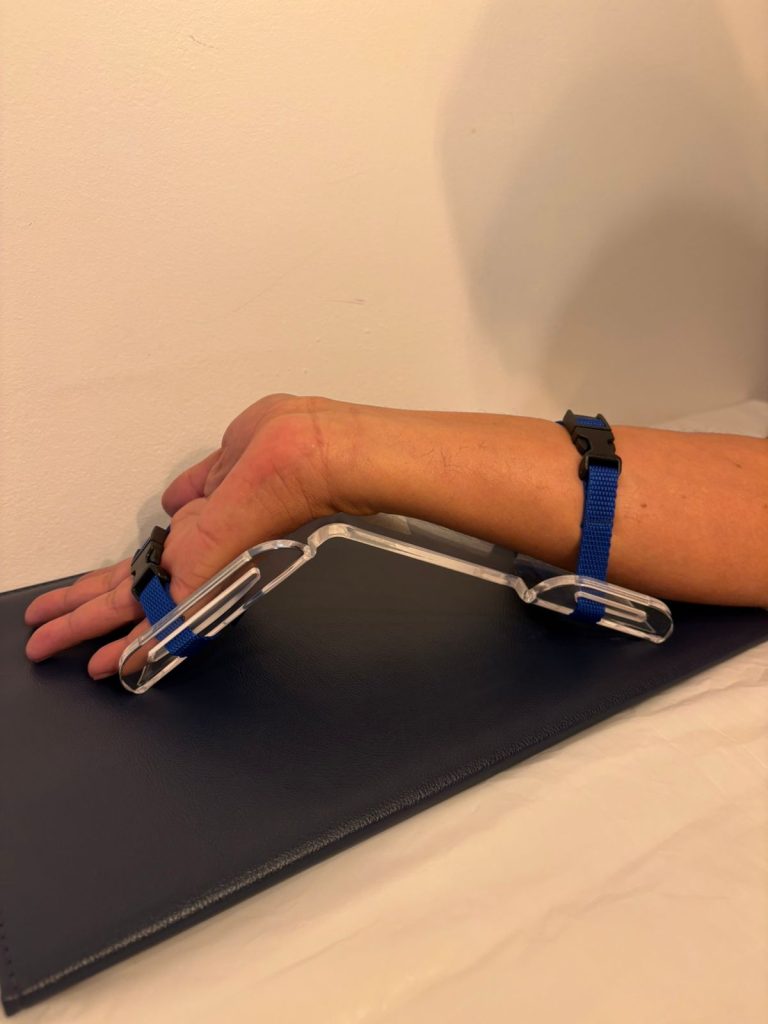 Inmovilizador de mano par canalización evitando que se mueva la muñeca indevidamente cuando hay vías arteriales y periféricas (venosas) colocadas. material acrílico y vandas de sujeción.