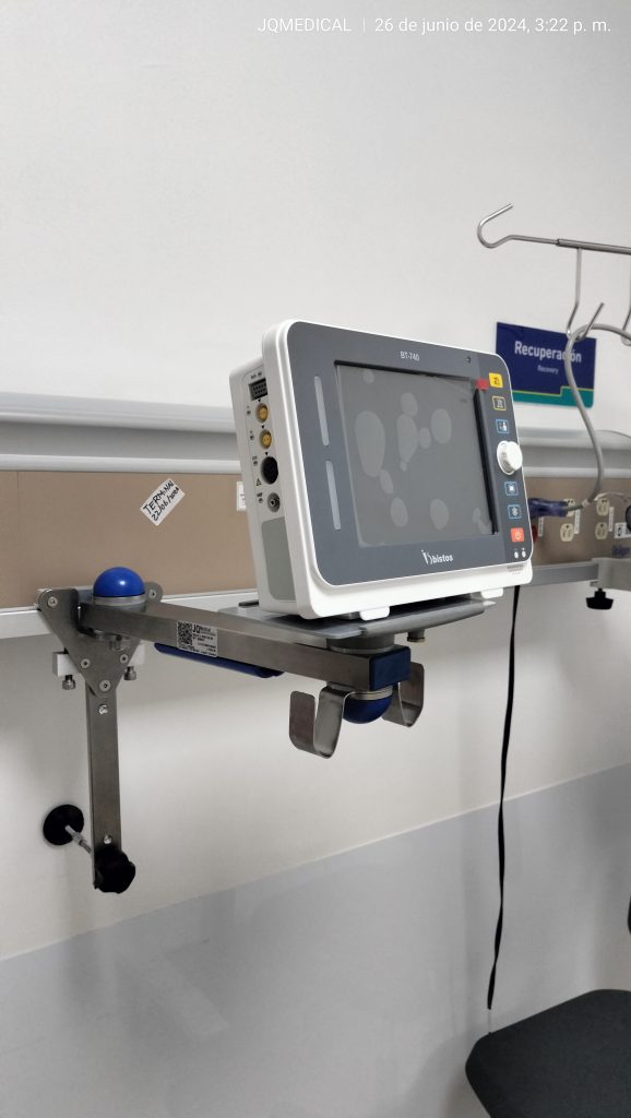 Brazo principal en tubo acero inoxidable, bujes internos en poliuretano color azul, soporte principal de monitor en lámina de aluminio, sistema de anclaje rápido, 2 ganchos en acero inoxidable para cables, brazo principal giro 90grados, soporte principal giro 90 grados, soporte principal de monitor sin inclinación frontal. Platina de anclaje con inclinación frontal. Opcional anclajes a riel horizontal o vertical.